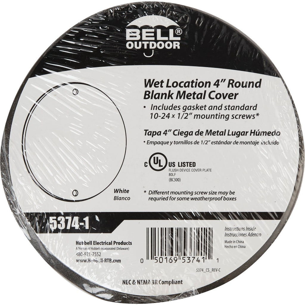 Bell Single Gang Round Die-Cast Metal White Blank Outdoor Box Cover, Shrink Wrapped
