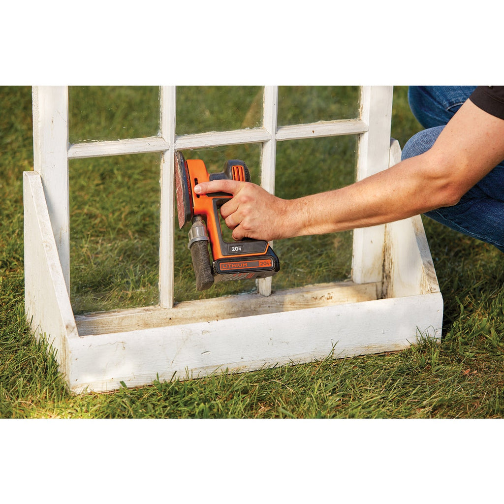 Black & Decker Mouse cordless sander offers the power, performance, and maneuverability to give projects an ultra-smooth finish. Compact and ergonomic design helps to provide control and accessibility in tight corners and spaces. Hook and loop system helps make paper changes easy. The 12,000 OPM (orbits per minute) speed allows for quick debris removal and the high-performance dust collection system ensures the workspace stays clean. Included detail finger attachment can be interchanged to help sand hard to reach spaces. Includes 1.5 Ah 20V MAX lithium-ion battery, charger, detail finger attachment, (2) sheets paper, (1) sheet detail finger paper, (4) extra sheets tip paper.
