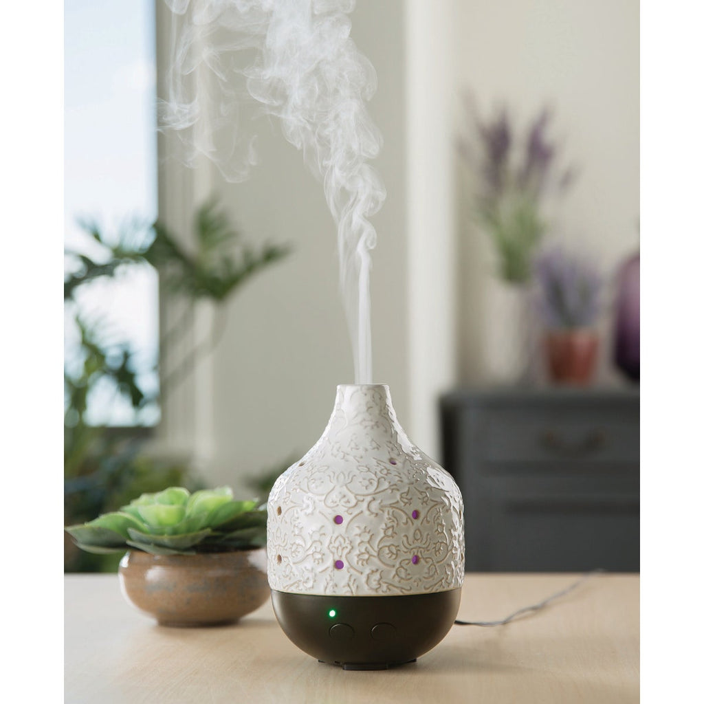 The large Botanical Essential Oil Diffuser has a creamy, ivory reactive glaze accented with a gorgeous scroll motif on a brown base. Choose between 8 LED Light colors for a single color glow, or allow light to effortlessly rotate between all colors. Set to fit your mood, holiday or decor. Features 2 mist settings. Intermittent, which lasts for 24 hours, and Continual, which lasts for 10 hours. Both with automatically shut off when water tank is empty. Tank holds 250 mL of liquid. Includes diffuser, designed sleeve, measuring cup and 5 Ft. electrical cord. Recommended use with our 100% pure, therapeutic grade essential oil singles and blends or our all-natural Airome Scents blends.