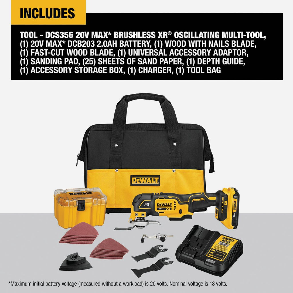 This 20V MAX cordless kit includes one brushless 3-speed oscillating multi-tool, 28 popular cutting and sanding attachments, two wood cutting blades, universal accessory adaptor, one 2.0 Ah battery, charger, and tool bag. The DCS356 oscillating multi-tool has a powerful brushless motor providing up to 57% more run time over a similar brushed tool. The 3-speed selector allows users to choose their speed setting based on application. The Quick-Change accessory system allows you to change blades quickly and easily, and with the universal accessory adaptor, it is compatible with most oscillating tool accessories. The DUAL-GRIP variable speed trigger provides ultimate speed and application control. The DeWalt oscillating tool guide system allows you to customize the depth or height for accurate repeatability, and the bright LED light illuminates dark work spaces. Includes (1) DCS356 20V MAX XR oscillating multi-tool, (1) 20V MAX DCB203 2.0 Ah battery, (1) battery charger, (1) wood with nails blade, (1) fast-cut wood blade, (1) universal adapter, (1) sanding pad, (1) depth guide, (25) sheets of sand paper, (1) accessory storage box, (1) charger, (1) tool bag.