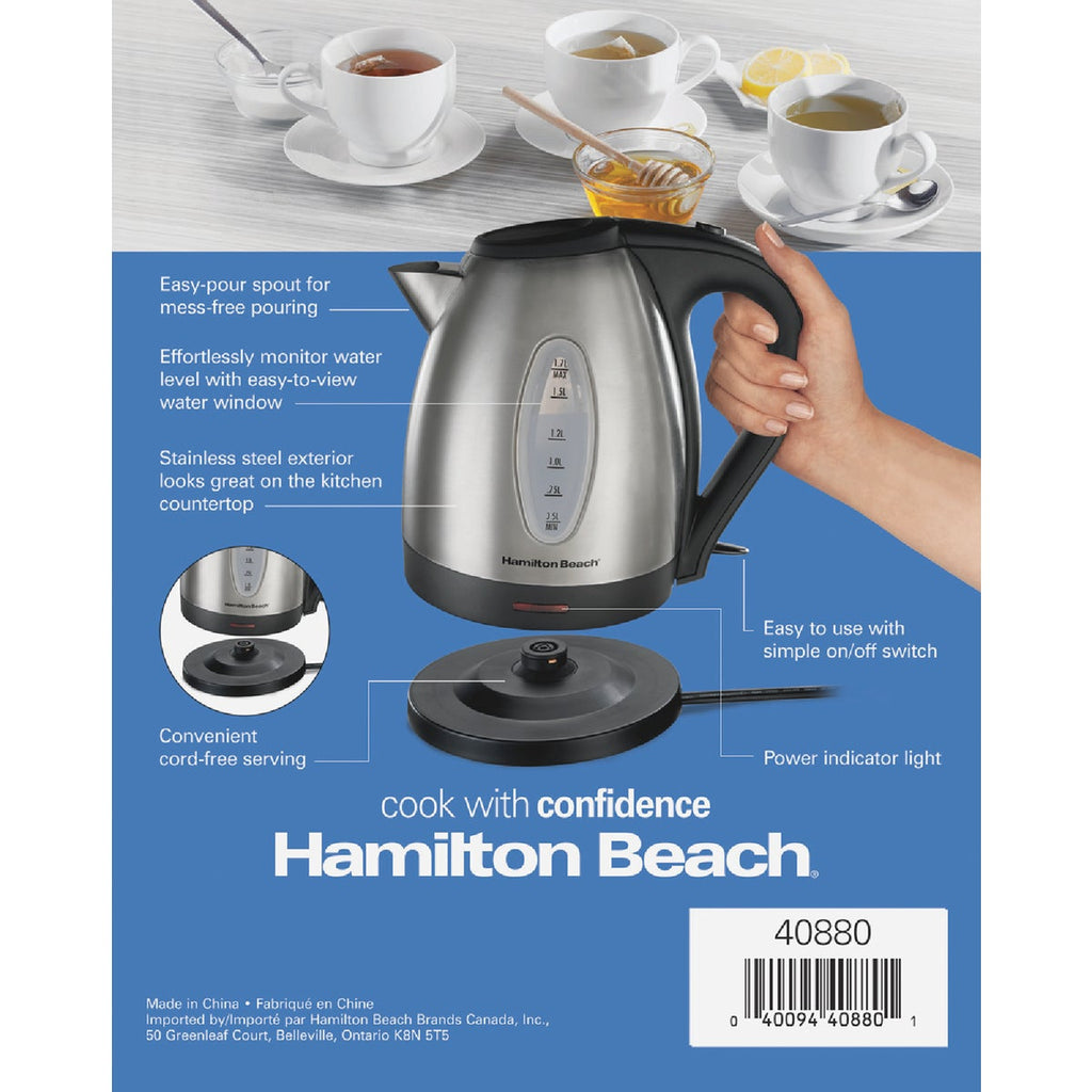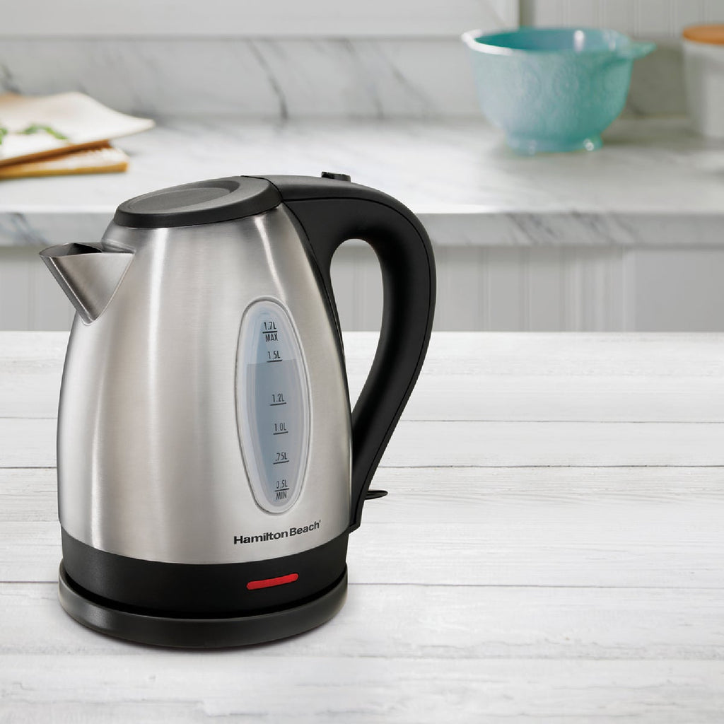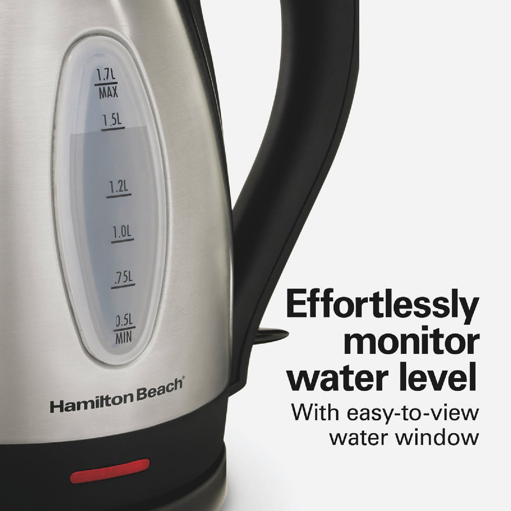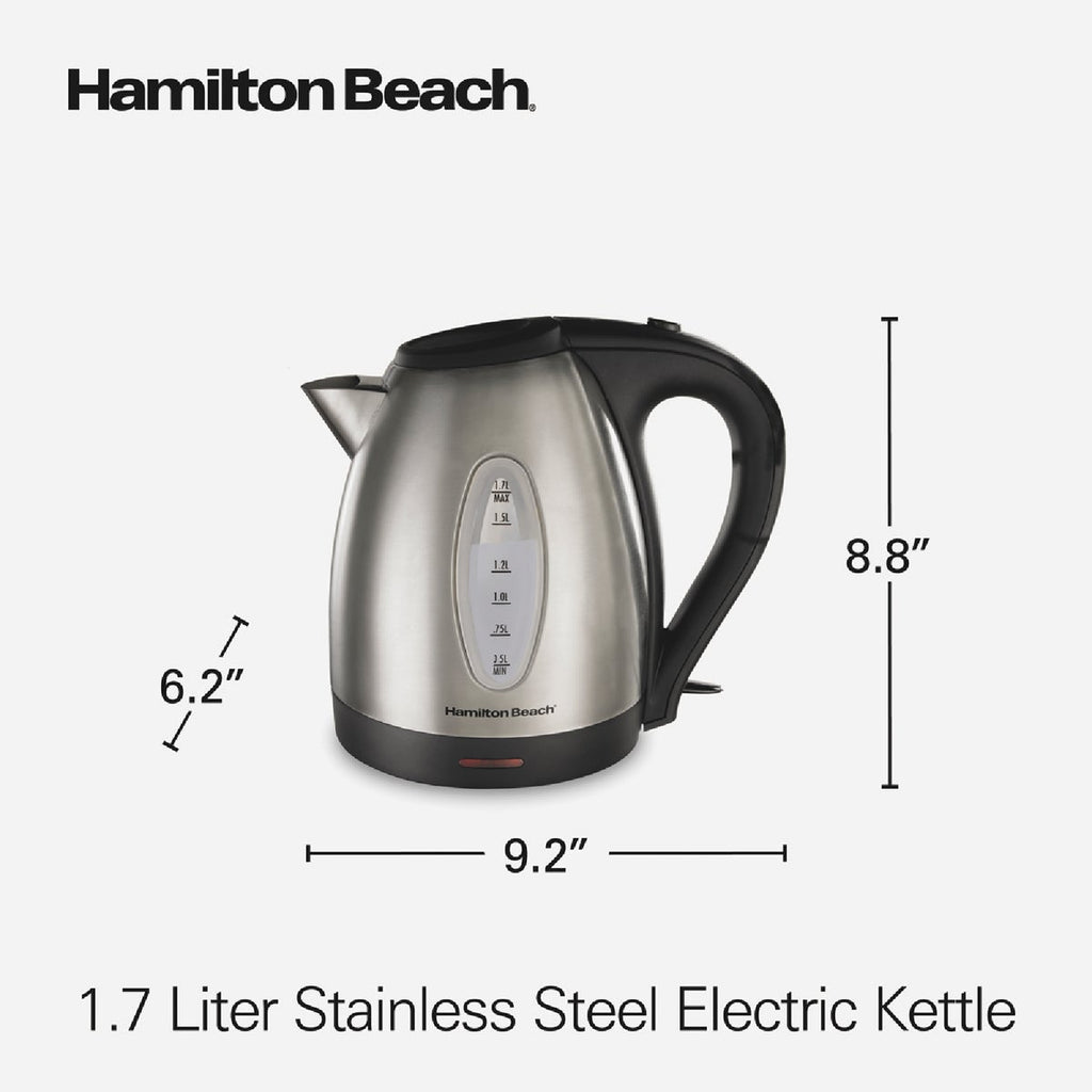 The Hamilton Beach Stainless Steel Electric Kettle has 1500 watts to heat up to 1.7 liters of water faster than a microwave and safer than a stovetop. You'll love the convenience of making a quick, hot cup of tea, instant coffee, French press or hot cocoa without the wait. Perfect for hectic mornings or anytime you're in a hurry and need boiling water fast. Quickly boil water to make a bowl of ramen, instant oatmeal, or instant grits. The cordless kettle lifts off the base to serve hot water at the tabletop or anywhere you're serving hot beverages. It's also great for boiling water to add to the pot when making pasta, soups, stews and other recipes. The automatic shutoff feature with boil-dry protection keeps the kettle from scorching if the water gets low. The kettle is designed with an easy-pour spout to reduce messy drips. It's easy to use with a simple on/off switch and includes a removable mesh filter that prevents mineral scale from getting in your cup. The filter removes easily for quick cleaning. The upscale stainless steel exterior will look great on your kitchen countertop.