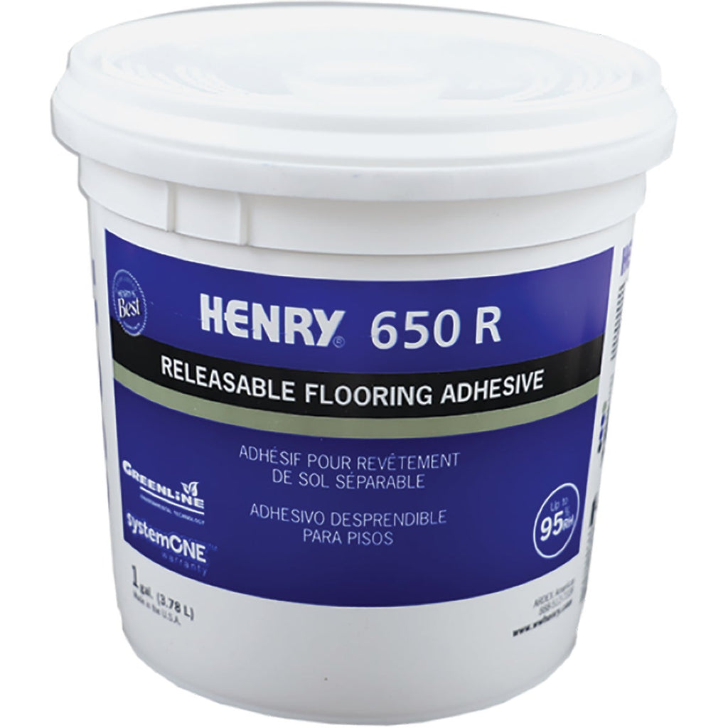 Henry 650R Releasable is a premium pressure-sensitive adhesive with releasable bonding properties that firmly adhere the floor yet enable easy removal of the flooring at any time with no damage to the subfloor. Henry 650R Releasable is ideal for reducing the remodel workload in rental units, condominiums, or other spaces which undergo frequent replacement of the floor covering. An excellent alternative to loose-lay installation when flooring manufacturer quidelines permit adhesive use. Bonds to concrete, cementitious underlayments, suspended APA grade underlayment plywood, radiant heat subfloors where temperatures do not exceed 85 degrees, terrazzo, and fully adhered, noncushion-backed resilient on all grade levels. Can also be used over properly primed gypsum underlayments above grade only. Solvent-free, nonflammable, plasticizer migration-resistant. Tool recommendations: U-notch trowel (1/32" D. x 1/16" W. x 1/32" A.) and short nap roller (3/16" to 3/8"). Wet residue can be removed with a clean white cloth dampened with soapy water. Mineral spirits will remove dried adhesive residue.