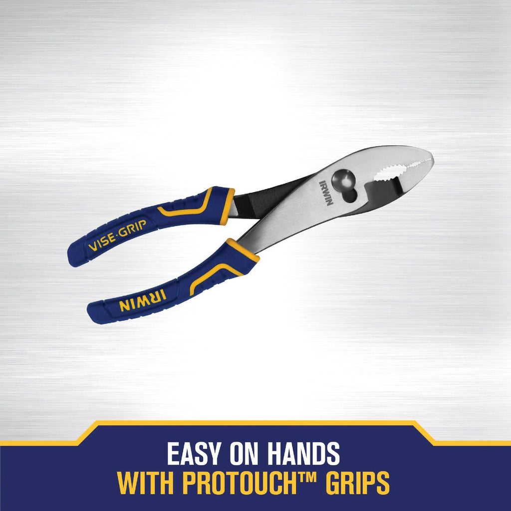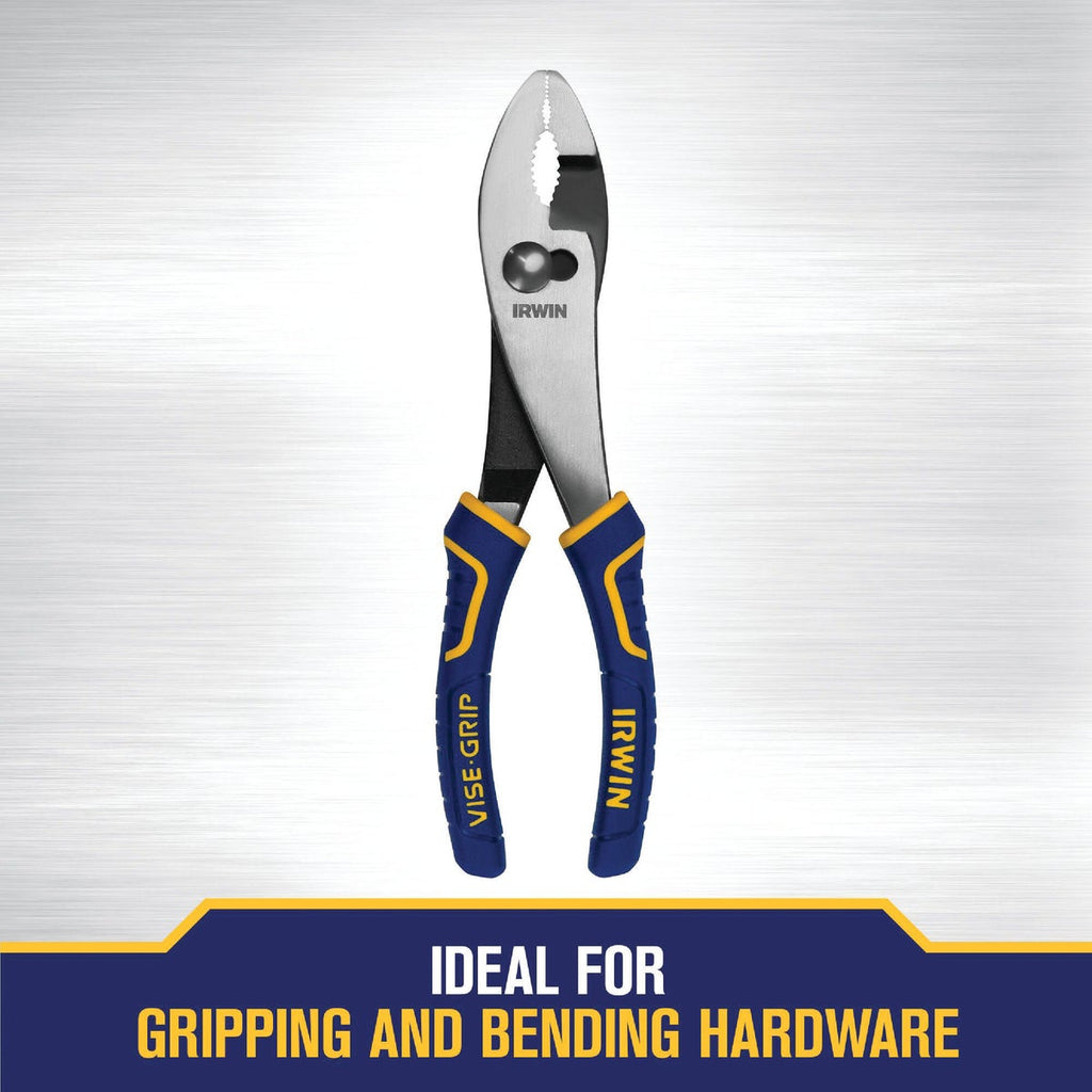 If you're looking for a durable and reliable pair of slip joint pliers, look no further than the Irwin Vise-Grip 8 In. Slip Joint Pliers. These Vise-Grip pliers are constructed of nickel chromium steel for superior strength and durability. Their machined jaws provide maximum gripping strength, while their induction-hardened cutting edge ensures that the cutting blades stay sharper for longer. The slip-joint pivot fulcrum allows for two adjustment positions, both narrow and wide. Ideal for a variety of tasks around the home or workshop, their ProTouch grips provide you with maximum control while simultaneously offering extra comfort and less hand fatigue, making even the most challenging projects a breeze. Plus, all of their specs meet or exceed ANSI (American National Standards Institute) specifications, so you know they're top quality. So why wait? Add the Irwin Vise-Grip 8 In. Slip Joint Pliers to your toolkit today and make every task easier!