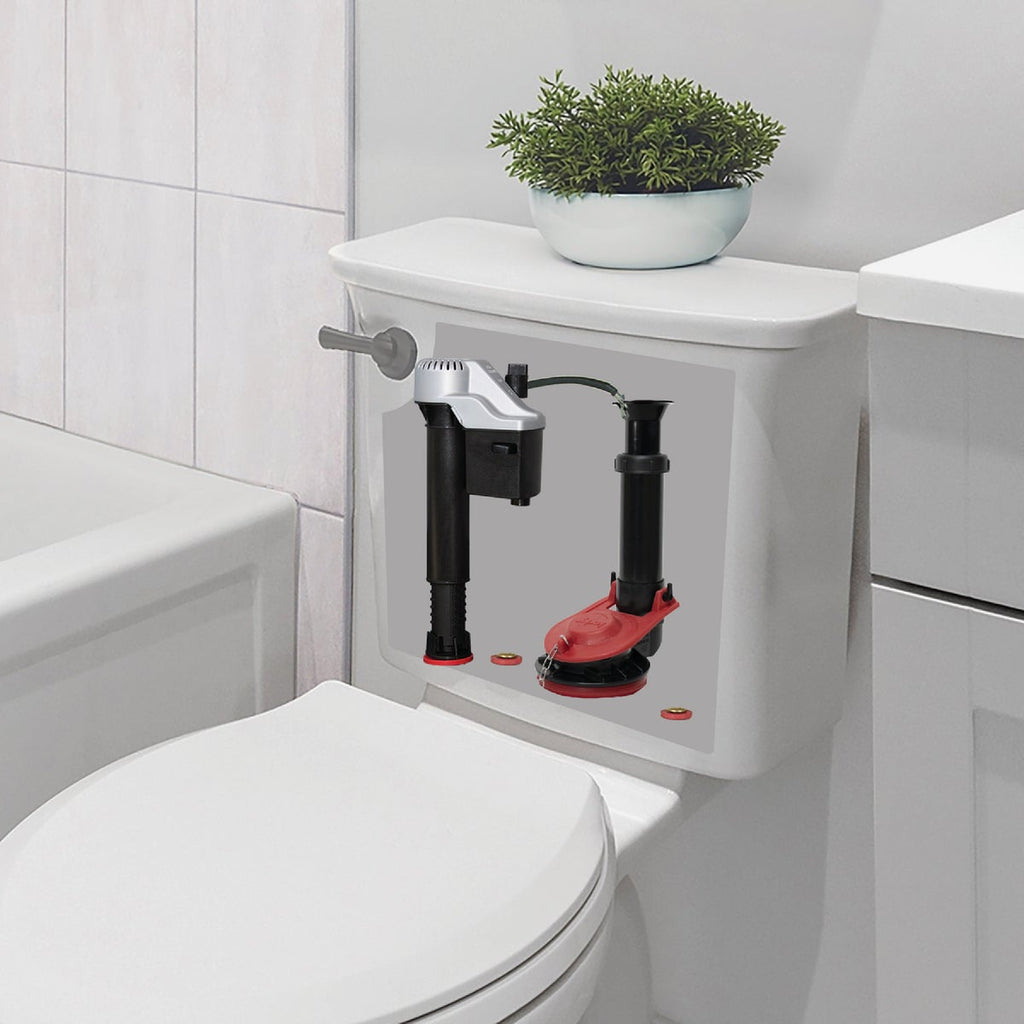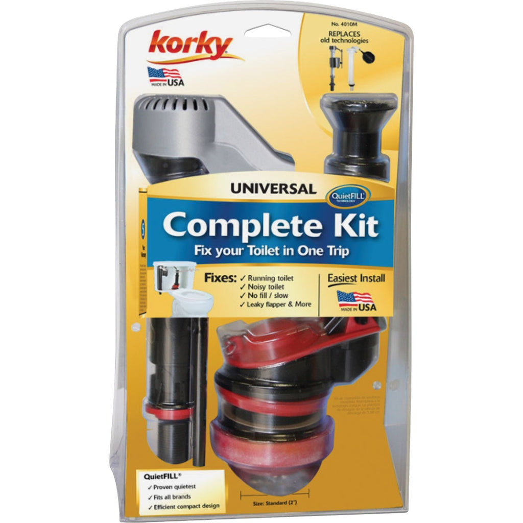 The Korky Complete Toilet Repair Kit allows for a full overhaul of your toilet in one trip and is designed to fix no/slow refilling, running, and noisy toilets. The complete kit includes a fill valve, flush valve, flapper, and tank-to-bowl hardware. The Korky QuietFILL Toilet Fill Valve is quieter than other fill valves. It has a universal design to fit all brands and features a wide range of adjustability to fit most toilets. Also included is an Easy Adjust 2 inch flush valve that's fully adjustable, no hack-saw required. The flapper is made from exclusive longest lasting red rubber that resists chlorine, bacteria, city water treatment, hard water, and well water. Easy to install.