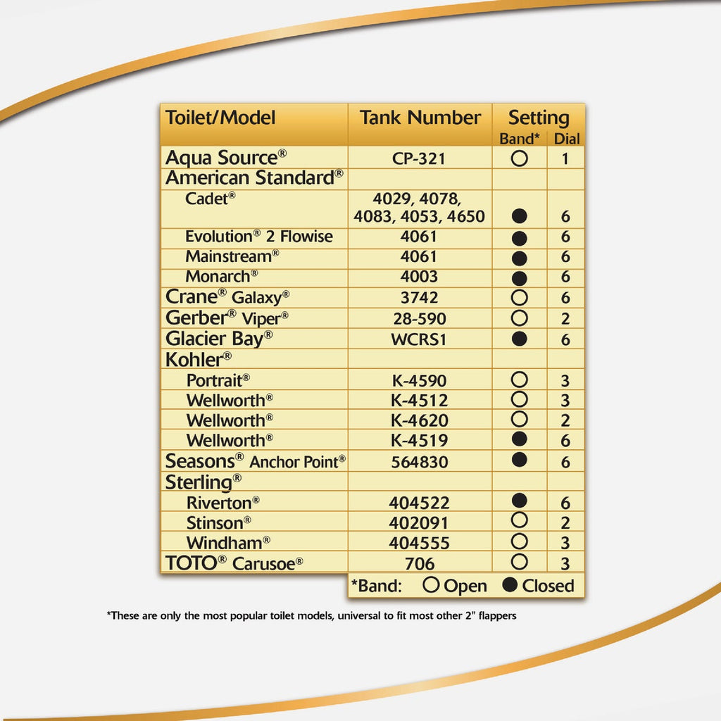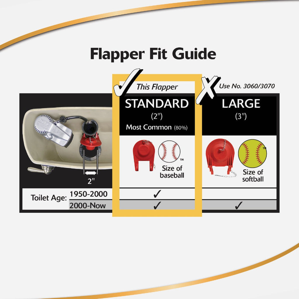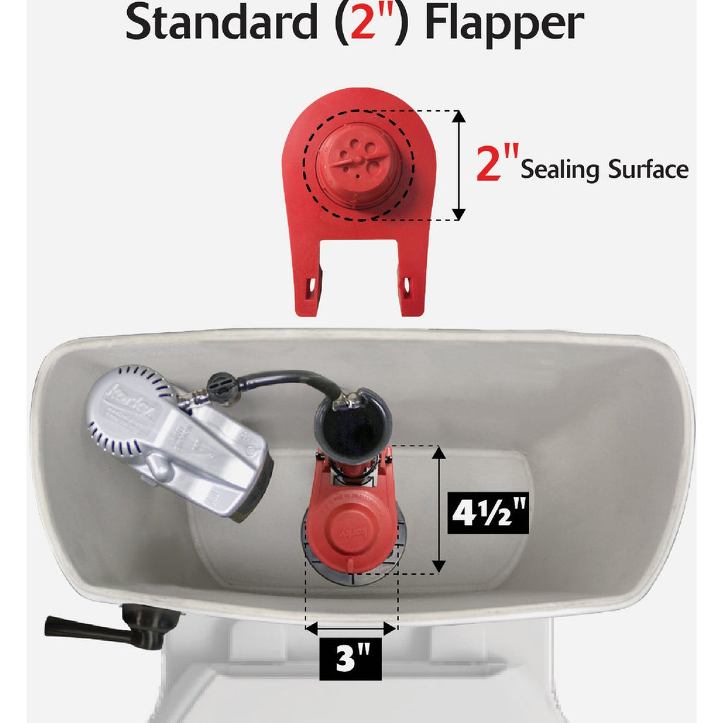 The Korky Ultra Water Saver Flapper is the most universal 2" flapper available. The flapper adjusts to match original toilet settings and eliminates water waste by decreasing the amount of water flushed. Ideal for all standard 2 inch toilets, including: 1.28, 1.6, 3.5 and 5 GPF (gallons per flush). The exclusive longest lasting red rubber resists chlorine, bacteria, city water treatment, hard water, and well water. Recommended by the Clorox help line, this Korky flapper is proven longest lasting. The adjustable flapper has multiple settings to ensure it fits popular 2" toilet models: American Standard Cadet (4029, 4078, 4083, 4053, 4650), Monarch (4003), Mainstream (4061), Evolution 2 Flowise (4061), Kohler Wellworth (K-4620), Wellworth (K-4519), and TOTO (706). Made of flexible rubber for a tight seal and easy to install.