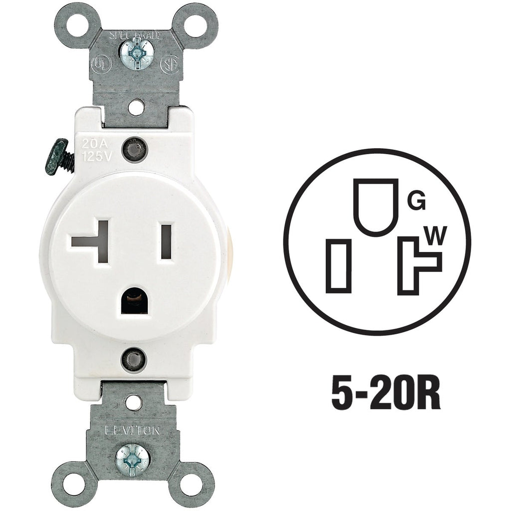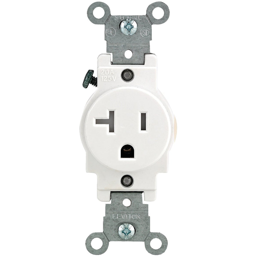 Commercial grade, tamper-resistant nylon, single grounding receptacle. Shutter mechanism inside the receptacle blocks access to the contacts unless a 2-prong plug is inserted, ensuring that items such as hairpins and keys will be locked out. Features a narrow body, back and side wired, and large-head terminal screw that accepts up to No. 10 copper wire. Triple wire power contacts for maximum conductivity and plug retention. Captive mounting screws for fast installation, convenient washer-type break-off plaster ears for best flush alignment. Break-off tabs for easy 2-circuit conversion. Heavy-gauge rust-resistant steel mounting strap. Limited 10-year warranty.