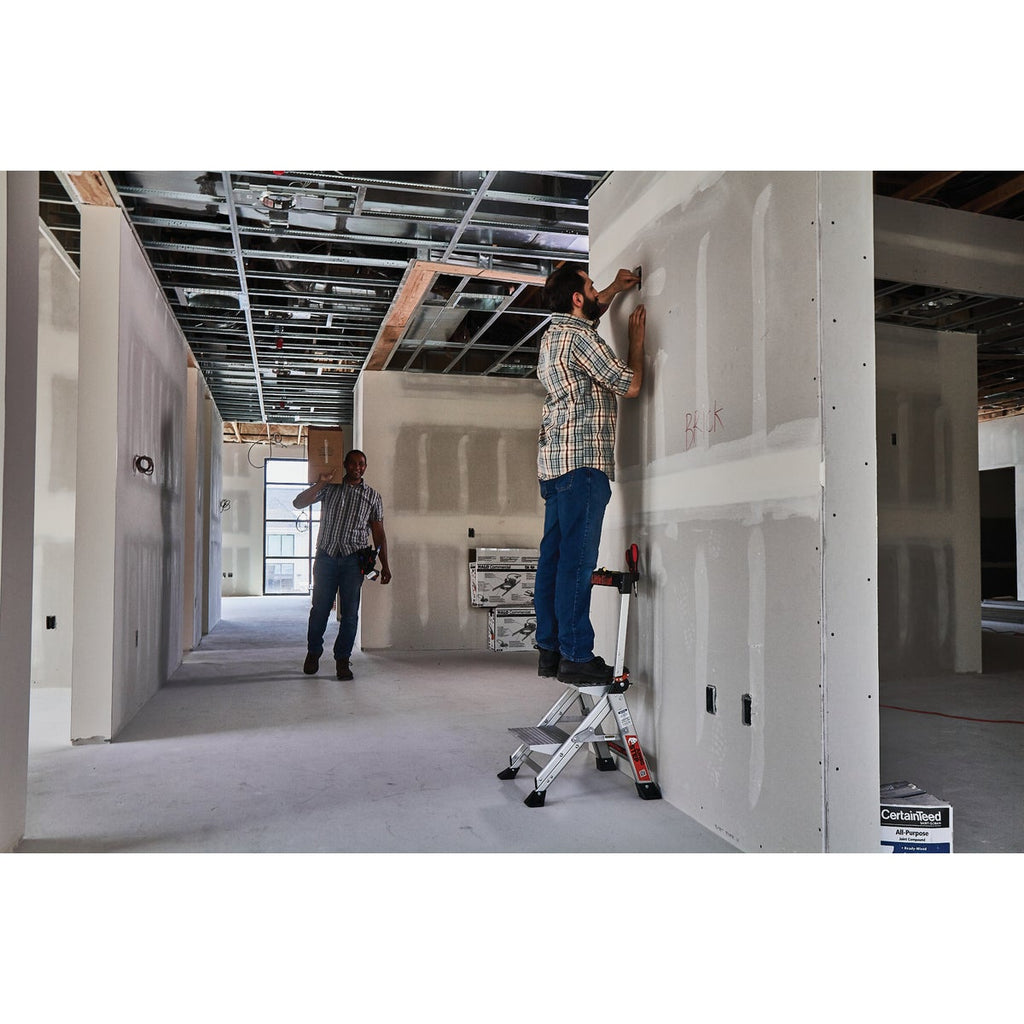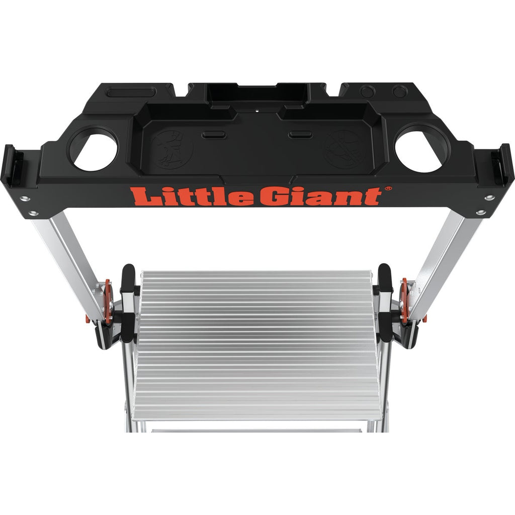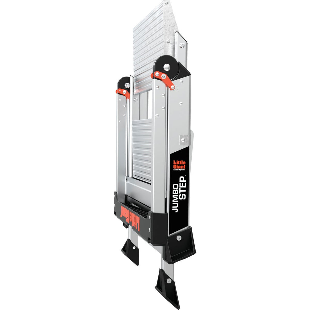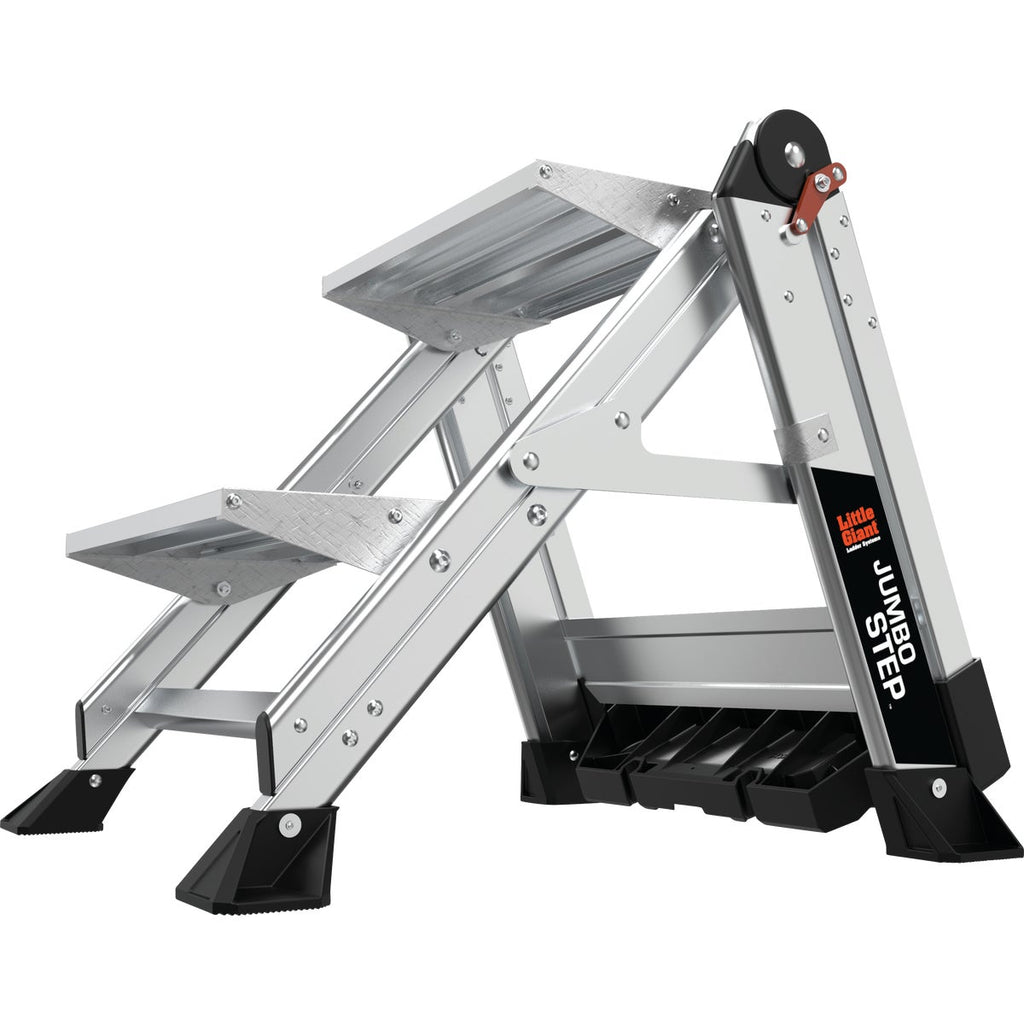 Not all tasks require a full-sized ladder, and that is where the Jumbo Step from Little Giant comes in. The Jumbo Step is a lightweight aluminum stepladder, and with its compact design, it is the perfect tool for small-scale or at-home projects. The Jumbo 3-Step meets or exceeds all OSHA and ANSI standards, and is rated Type IAA to hold 375 pounds. 21.5 In. W. This ladder features an innovative top cap tool tray and handrail. The handrail feature extends to improve safety and minimize feelings of vertigo. The innovative top cap has slots for all of your necessary tools, including your smartphone. Now, you can keep all of your supplies within arms reach while working on the ladder.