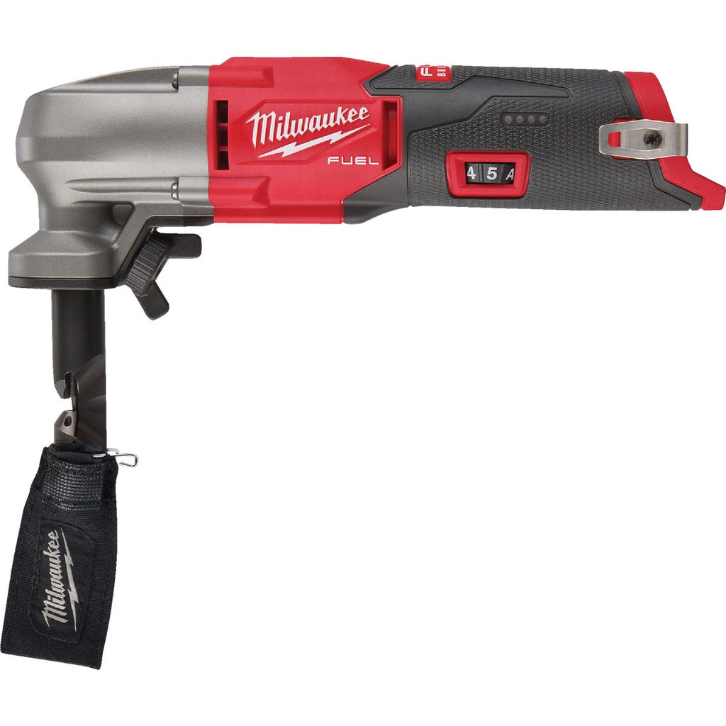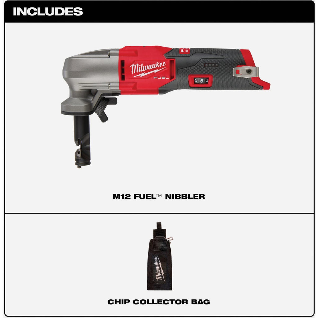 The MILWAUKEE M12 FUEL 16-Gauge Variable Speed Nibbler is a compact light weight tool that provides the same cutting capacity as its 18V competitors on a 12V system. Delivering fast clean cuts in 16-gauge mild steel, the nibbler is rated for 18-gauge stainless steel and 12-gauge aluminum. Milwaukee M12 FUEL 16-Gauge Variable Speed Nibbler has the power to perform in heavy applications such as cutting up to 22-gauge spiral duct seams. The nibbler tool provides a variable speed dial, tool-free die holder orientation change, and LED work light offers maximum control and productivity. The unique chip collection bag, kitted with the tool, reduces jobsite cleanup. The Milwaukee compact and light weight form factor enables greater access and mobility on the jobsite. Tool Only.