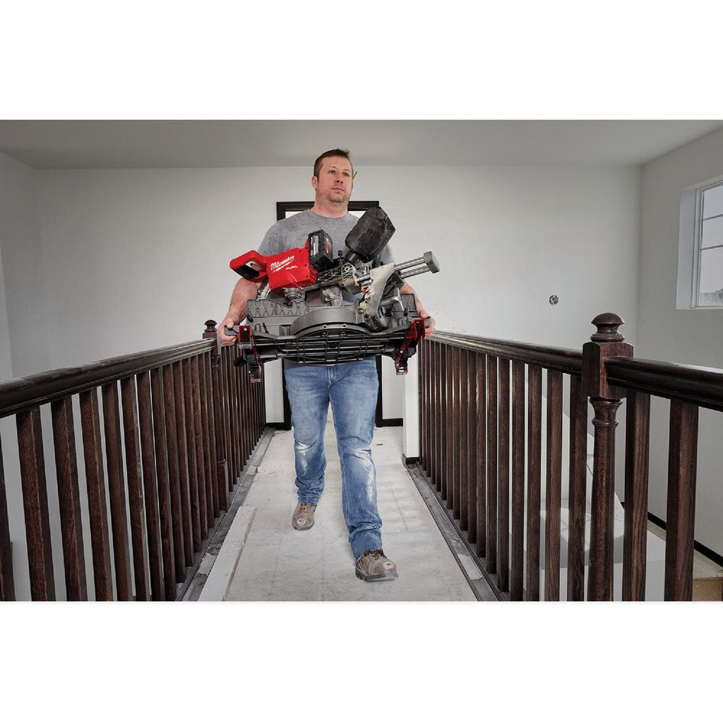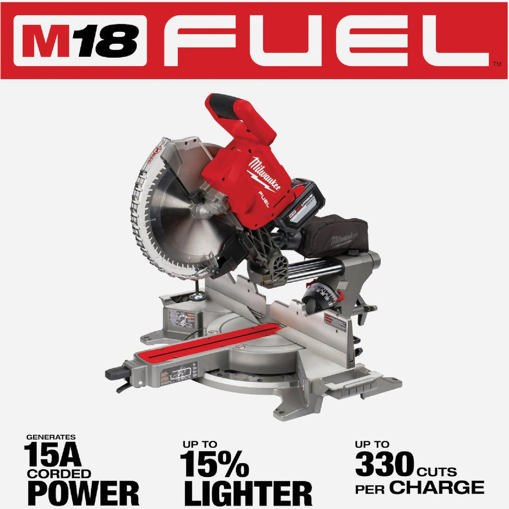 The M18 FUEL 12" Dual Bevel Sliding Compound Miter Saw with ONE-KEY Kit generates the power of 15 amp corded saws and is designed for the professional carpenter, remodeler, and general contractor. The miter saw is up to 15% lighter than competitor saws and delivers up to 330 cuts per charge. It has the same capacity as corded a 12-inch miter saw, providing you with the ability to perform all of your critical applications while increasing your portability, efficiency, and productivity on the jobsite. The cordless miter saw features the POWERSTATE Brushless Motor, REDLINK PLUS Tool Intelligence, and is powered by M18 REDLITHIUM batteries. The saw has a Shadow Cut Line LED light, an adjustable stainless steel detent plate, cam locking miter system and easy carry side handles, making it a leading miter saw solution. In addition to the saw, this kit includes one M18 REDLITHIUM HIGH OUTPUT HD12.0 battery, an M18 & M12 Rapid Charger, handles and clamp.