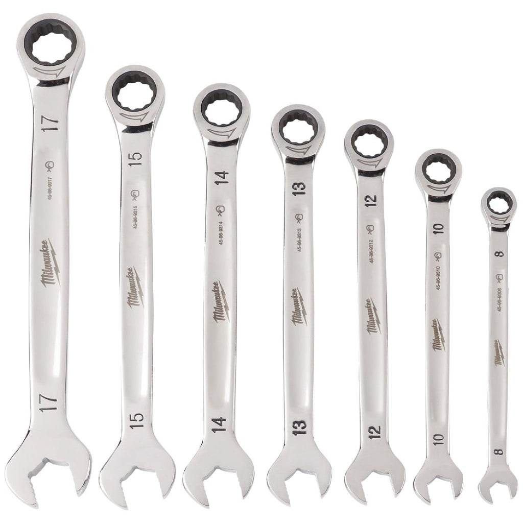 Milwaukee's ratcheting combination wrenches offer an industry-leading 2.5 of arc swing, allowing users to work quickly and efficiently even in the tightest of spaces. Durable double-stacked pawls in the ratcheting mechanism offer longest ratchet life and best access with 144 ratcheting positions. The MAX BITE open-end grip improves the wrench's grip on nuts and bolts, offering 25% more torque than smooth-faced wrenches. The comfortable I-Beam handle design allows superior user comfort. Milwaukee wrenches feature ink-filled size labels for easy size identification, as well as quick distinction between SAE and metric sets. The 7-Piece kits come in a portable, locking storage tray, offering organization both on and off the jobsite. Includes one each: 8 mm, 10 mm, 12 mm, 13 mm, 14 mm, 15 mm, 17 mm.