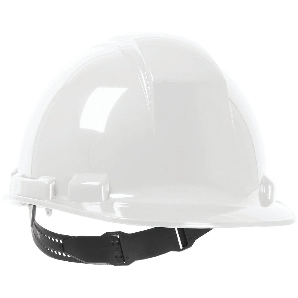 Durable cap style hard hat with pin lock adjustment system. Lightweight shell made with UV stabilized HDPE (High Density Polyethylene) reduces worker fatigue. 4-point quick release suspension with strong textile straps and crown comfort pad provides a comfortable and secure fit. Pin-lock adjustment system with easy to read hat sizing marks. Precise height adjustment settings to ensure proper depth. Low nape strap provides a secure fit, allowing the hard hat to stay on your head even when workers are looking down or bending over. Non-chaffing, replaceable foam sweatband for maximum sweat absorption. Shell has a with a rain trough for extra convenience in adverse weather conditions. Universal accessory slots accommodate a variety of eye, face, and hearing protection products. Meets ANSI/ISEA Z89.1 Type 1 and CSA Z94.1 Type 1 requirements. Fulfills Class E Electrical Insulation requirements.